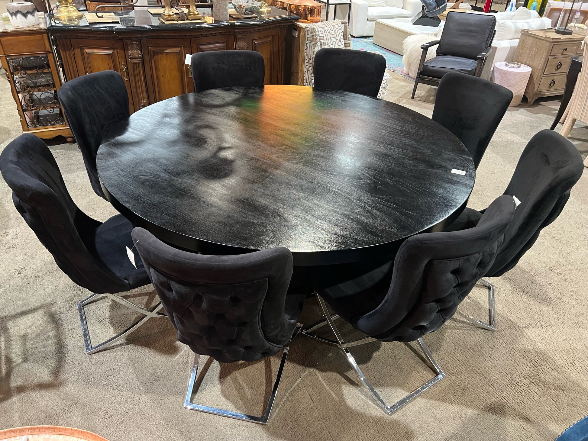 Table & Chairs Black Mahogany Wood & Velvet